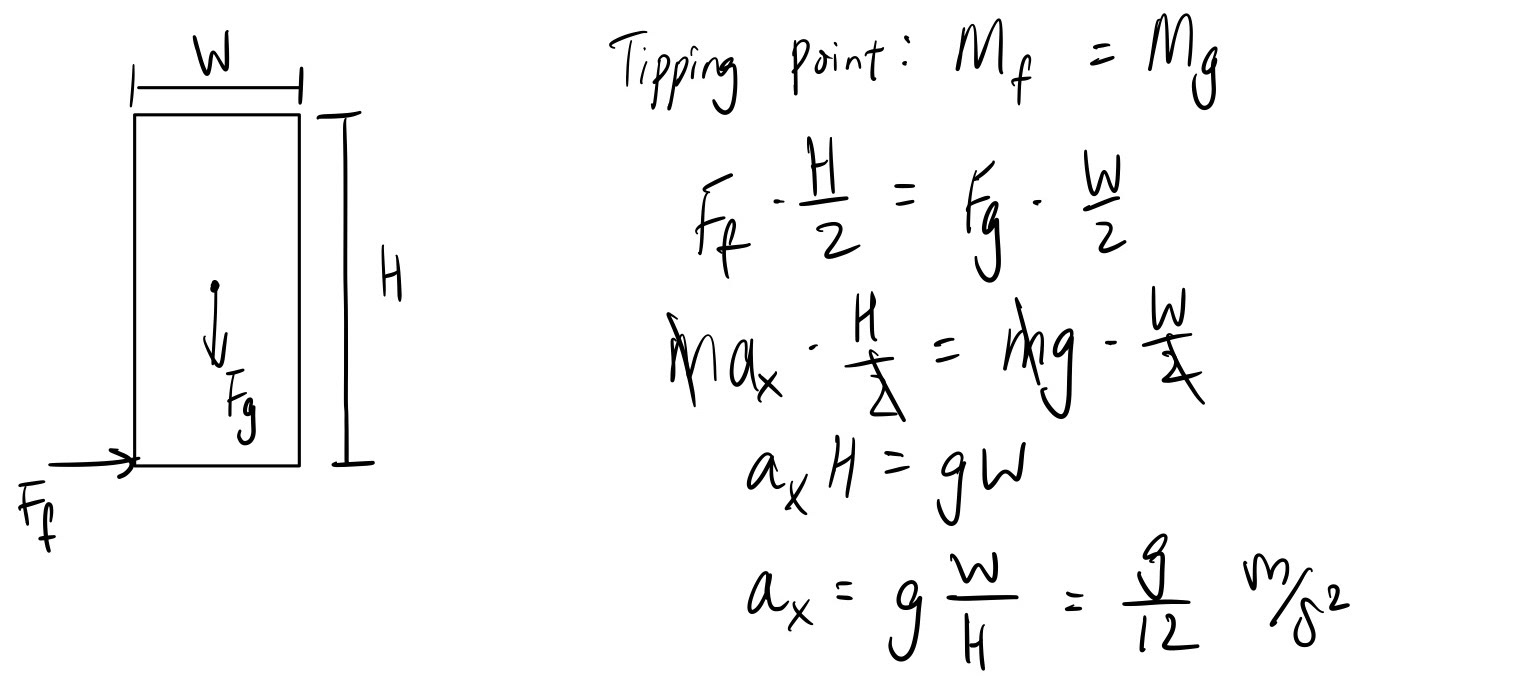 The aim of this project was to create a car with a velocity curve that would allow us to balance a vertical beam. This was also a friendly competition between classmates, as such, we were competing against each other to build the fastest car possible, while still being able to balance the beam. To achieve our goal, we first determine the optimal velocity curve shape to be a triangular velocity profile. From this profile, we knew that the acceleration of the car will be constant. As seen in the figures below, we calculated the maximum acceleration the car can have before the beam tips over. Using this acceleration information, and also the dimensions of the beam (40x40mm aluminum extrusion), we created a simulation in SolidWorks to verify our calculations. The acceleration was verified to be around 0.8175 m/s^2, and we can now build the car and program the velocity curve to the Arduino.