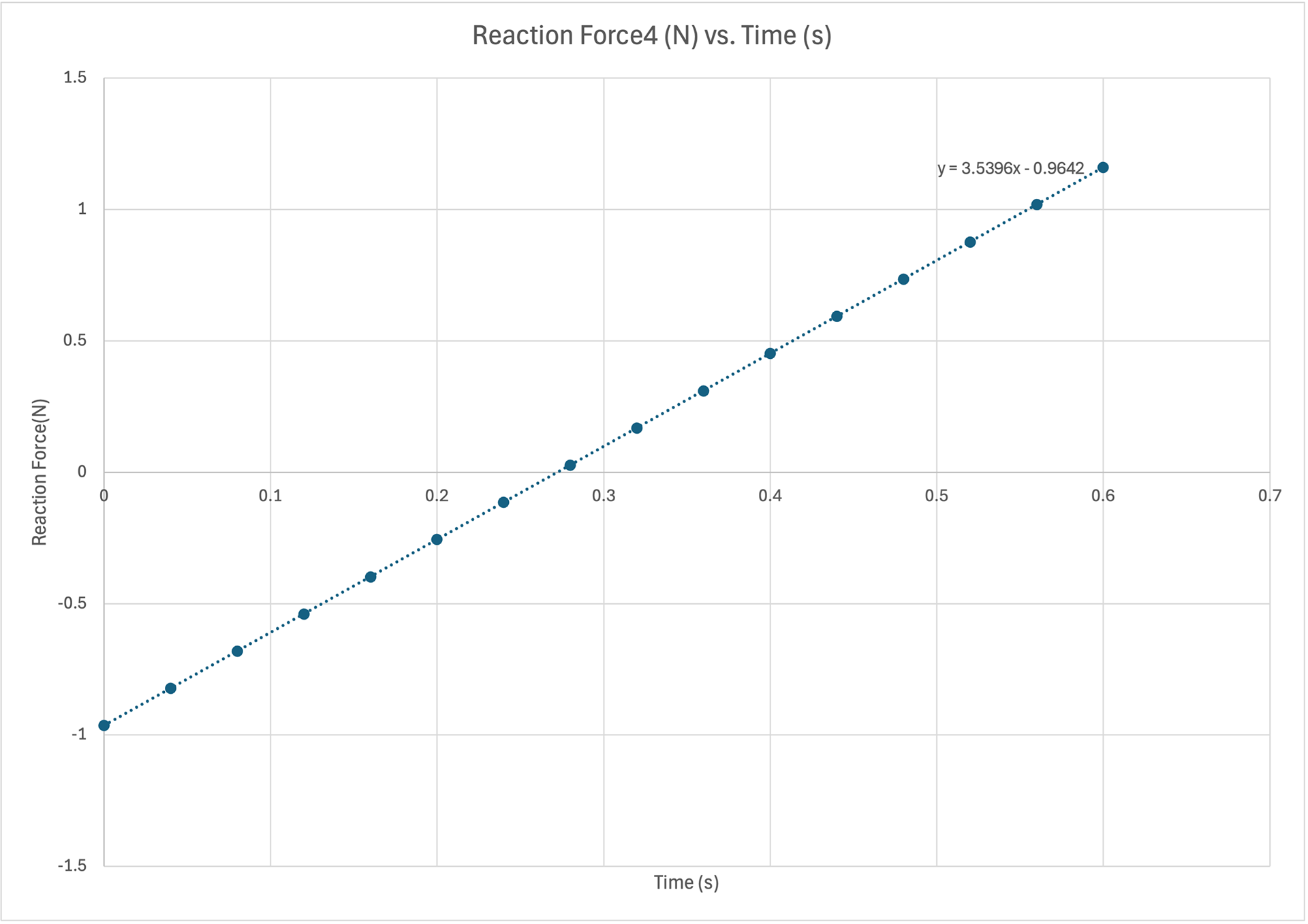 Using this graph generated from the simulation, at the point where the reaction force is zero is when the beam tips over. I can then extract the time at which this occurs during the simulation and solve for the acceleration, which matches the hand calculations above.